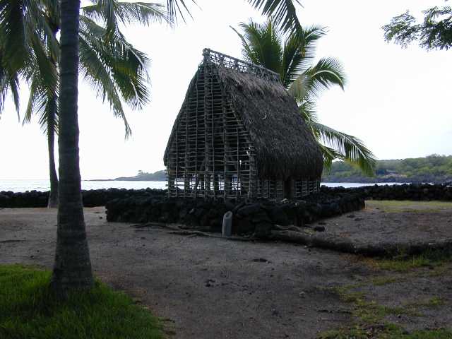 The framework for this half-size reconstruction of the Hale o Keawe temple is 'ohi'a wood tied with coconut-fiber. Ti leaves were tied on as thatching.
